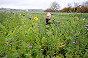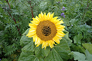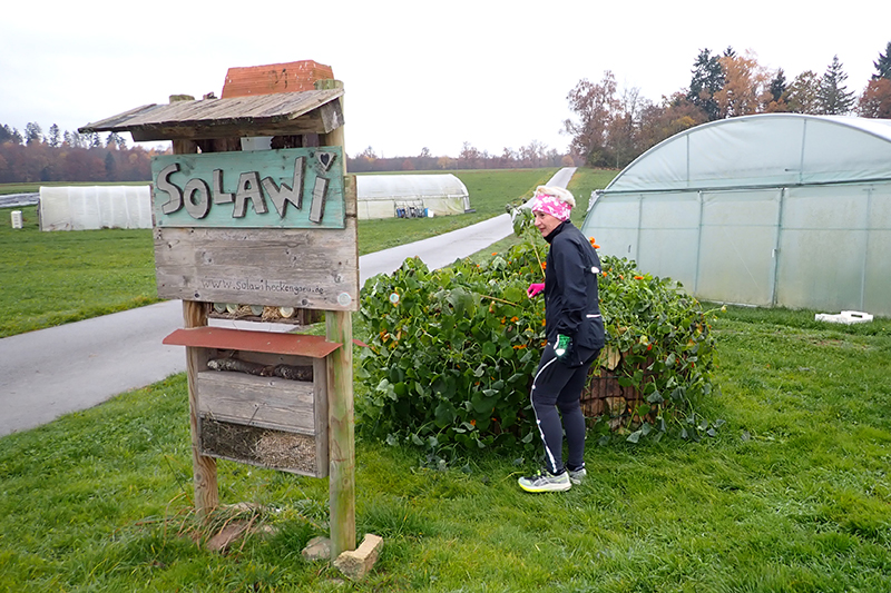 Bis wir Rutesheim wieder erreichen, gibt es noch viel Natur, zwischen der es hindurchzulaufen gilt. An einem Gewächshaus mitten in der Pampa bremst Kati kurz ein. Sie ist gartentechnisch auf einer ganz anderen Ebene als ich und kennt sich da aus. In einem Trog wachsen gelbe Blumen, das kann ich gerade noch erkennen. Kati erklärt mir wie sie heißen, was ich mangels botanischen Interesses im nächsten Moment schon wieder vergessen habe. Sie sind essbar und wirken entzündungshemmend. Da mich seit ein paar Tagen schon eine Entzündung plagt, höre ich etwas aufmerksamer zu. Die Entzündung befindet sich immerhin in einer doch laufrelevanten Körperregion, weil sie rein anatomisch gesehen die beiden Haxn zusammenhaltet. So lasse ich mich dazu hinreißen, mir eine Blüte in den Mund zu schieben. Schmeckt nach nix, ist aber ganz schön scharf und einfach nicht mein Ding. Soweit möglich spotze ich die zerkauten Blätter wieder aus und spüle ordentlich mit Apfelsaftschorle nach.