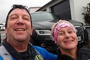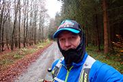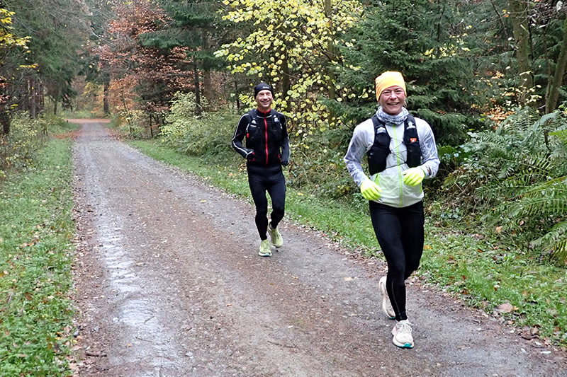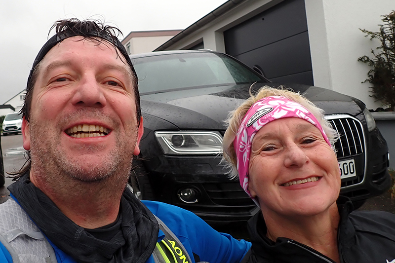 Und dann ist die erste Runde auch schon gleich vorbei. Kati und ich lassen uns in meinem Kofferraum nieder. Die erste Flasche Flötzinger wird geköpft und ich teile sie mit Kati. Sie will wissen, ob ich bei dem Sauwetter wirklich weiterlaufen möchte. Wollen ist jetzt vielleicht nicht das richtige Wort. Eher müssen. Ich war ja im Sommer schon mal hier, da hatte es 35 Grad und ich habe nach der ersten Runde gestreikt. Jetzt hat es acht Grad und es nieselt. Wie oft soll ich noch herfahren, damit das Wetter passt? Also breche ich wieder auf. Die Pause war eh lang genug, so dass mir schon etwas frisch wird. Kati erklärt mir noch kurz, dass sie sich nun in die Badewanne und danach mit einem Buch auf die Couch wirft. Eine Frechheit ist das schon. Mir bleiben noch über drei Stunden im Nieselregen. Ich entferne mich möglichst schnell vom Auto, so dass irgendwann umdrehen keinen Sinn mehr macht. Dabei werde ich auf den ersten Kilometern im Wald noch von Sandra Langguth und René Slavik überholt. Die beiden Spinner waren gestern auch schon am Start. Legen also einen Doppeldecker hin. Und sie grinst auch noch entspannt, als sie an mir vorbeiläuft. Ein paar Worte und weg sind die beiden.