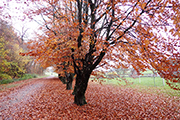 Auch die Kraxlalm liegt noch auf unserem Weg. Kraxln? Hier? Unmöglich! Es ist zwar hügelig und anstrengend, aber kraxln finde ich dann schon etwas übertrieben. Und Alm? Die gibt`s in den Alpen. Also in den richtigen Bergen. Das mit dem Kraxln klärt sich auf, als Kati und ich vorbeilaufen. Es gibt einen Hochseilgarten, in dem man zwischen den Bäumen herumkraxln kann. Eine Tätigkeit, deren Sinn ich nicht nachvollziehen kann. Aber gut, jedem das seine. Es gibt aber auch eine Minigolfbahn und eine - ich sag jetzt mal - eine Anlage, wo man das Minigolf mit einem Billardstecken auf Tischen spielt. Das könnte man doch in den Marathon einbauen. Auf der ersten Runde den Schläger schwingen, auf der zweiten dann den Queue. Aber gut, das würde beim ein oder andren dann doch zu lange dauern. Es geht wieder in den schönen Herbstwald. Das Nieseln habe ich inzwischen als gegeben hingenommen und somit ausgeblendet.