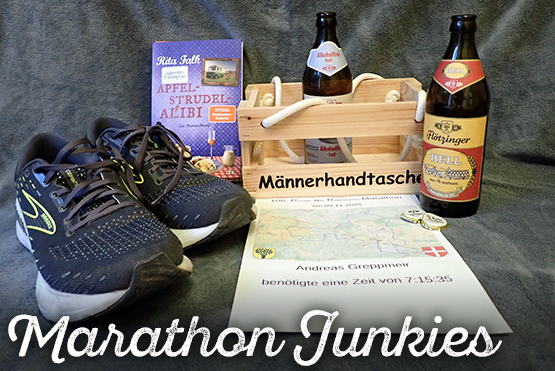 Da hätte ich doch glatt die Zielverpflegung vergessen. Also ab in den Keller und die hölzerne Herrenhandtasche bereitgestellt. Zwei Flaschen stilles Wasser, eine kleine Flasche Multi und dann noch – klar – zwei Flötzinger Hell und noch ein Flötz alkoholfrei. Das ist aber dann eher für die Kati als für mich. Jetzt kann nichts mehr schiefgehen. Ich lese noch zwei oder drei Kapitel. Dann ist Feierabend. Morgen muss ich früh raus. Die Nacht ist kurz. Etwas unruhig auch. Eine typische Nacht vor einem Marathon halt. Eine viertel Stunde bevor der Wecker klingelt, kriech ich schon aus den Federn. Jetzt noch einmal einschlafen wäre fatal. Dann bist Du nämlich wie erschlagen. So kann ich es auch etwas entspannter angehen lassen. Eine Tasse Kaffee, eine Nutella-Semmel und eine Katzenwäsche später sitz ich auch schon im Auto und mach mich auf ins Nachbarbundesland Baden-Württemberg.