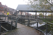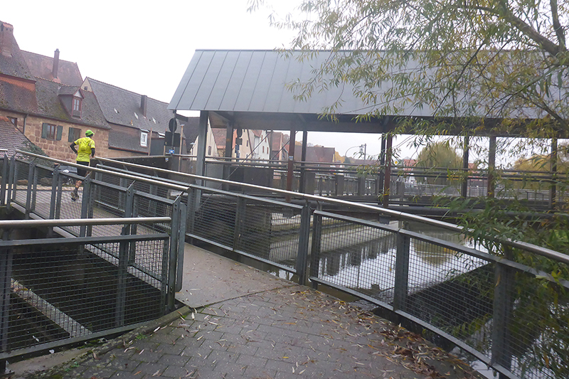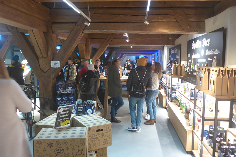 Zwischen den Kirchen St. Niklaus und St. Emmeram führen uns verwinkelte Gassen auf Kopfsteinpflaster bereits leicht aufwärts durch die Altstadt. Noch hat sich das Feld nicht entzerrt, so gibt es an einer Treppe einen kurzen Stau. Nach 300 Metern erreichen wir die Stadtbrauerei Spalt. Mit viel Leidenschaft werden hier 21 Bierspezialitäten vom Diplom-Braumeister komponiert. Malz verwendet man nur aus der Region, dazu besten Spalter Aromahopfen, hauseigenes Quellwasser und feinste Brauhefe. Dafür gibt es auch das Qualitätssiegel „Slow Brewing“. Es ist das härteste Siegel auf dem Markt, dabei wird nicht nur das Bier, sondern auch die Unternehmensführung, Marketing und Energiewirtschaft bewertet.