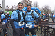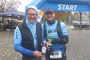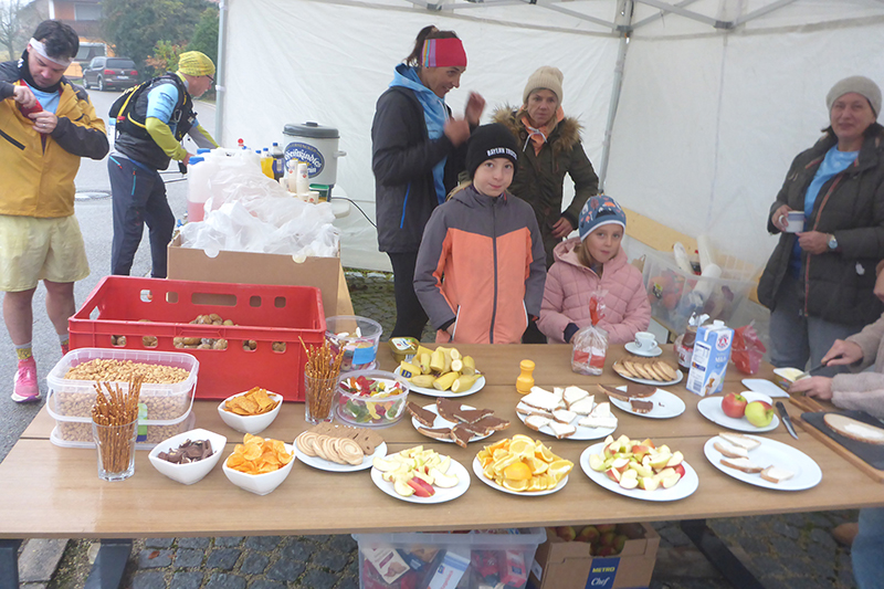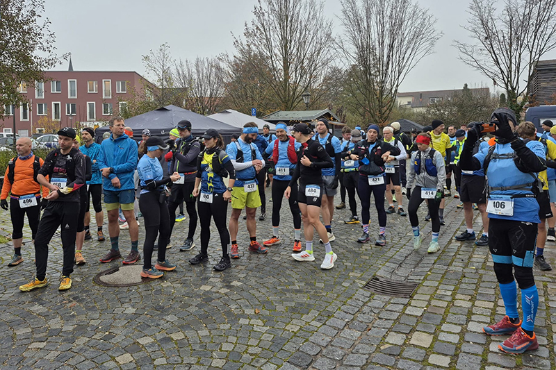 Wettermäßig hat sich leider in der Nacht auch einiges getan. Die Nebelglocke hat sich aufgelöst, dafür sind dichte Wolken aufgezogen, die auch immer wieder Regen mit sich bringen können. Aber immerhin, ist die Temperatur dafür etwas gestiegen. So 7 bis 8 Grad C sind zu erwarten. Viele am Start haben auch wirklich das Läufershirt an, es steht sinnbildlich für die Unterstützung, die man von den drei Partnern erhält. Aber dem Wetter geschuldet, zieht es auch ein Teil vor, mit Regenjacke zu laufen, obwohl es derzeit gerade nicht regnet. Übrig geblieben von 100 Angemeldeten, sind heute noch 8 Frauen und 74 Männer, da haben es wohl einige vorgezogen, bei dem nasskalten Wetter zu Hause zu bleiben.