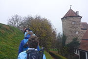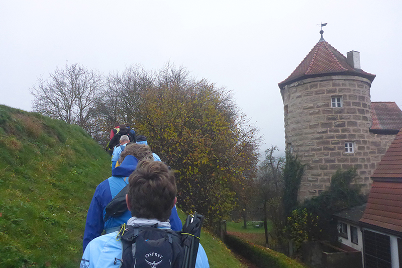 An der ehemaligen Stadtmauer und dem Reifenturm verlassen wir den Ort immer noch leicht aufwärts. Auf dem Galgenberg streifen wir nun die ersten Hopfenfelder. Hier wird der hochfeine Edelaromahopfen angebaut, der dem Spalter Bier seinen besonderen Geschmack verdankt. Er ist fünfmal wertvoller als viele andere Hopfensorten.