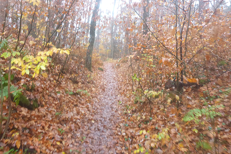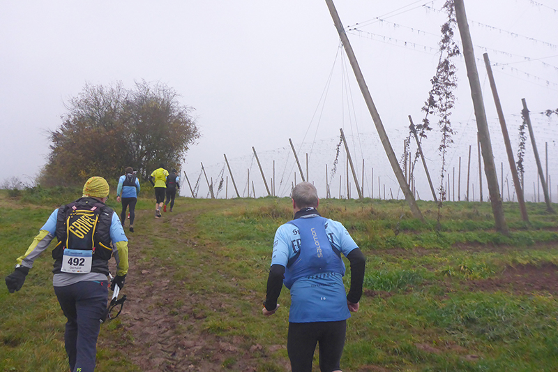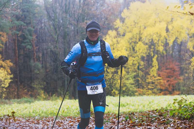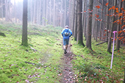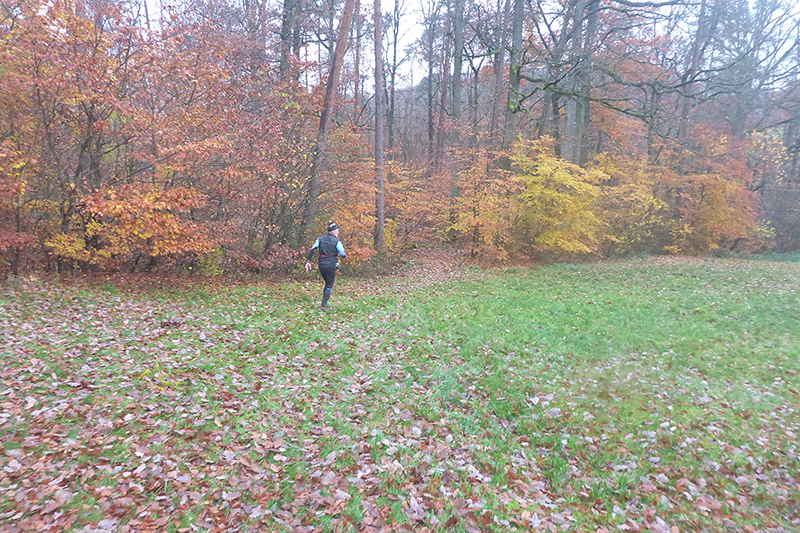 Auf Asphalt geht es wieder raus aus dem Ort und abwärts in den Wald hinein. Mittlerweile habe ich durch beschlagene und nasse Gläser nur noch eingeschränkte Sicht und so rausche ich an einer Abzweigung vorbei. Zum Glück werde ich schnell von einem Mitläufer wieder zurückkommandiert, was mir im Anschluss noch zwei weitere Male, zum Glück immer nur für kurze Abschnitte passiert. Mit meiner Brille bin ich heute wirklich beeinträchtigt, obwohl ich sie auch hin und wieder versuche trocken zu wischen. Etwa zwei Kilometer geht es immer leicht abwärts, wir wechseln des Öfteren Richtung und Terrain zwischen Trails, Wegen und Forststraßen. Die sind natürlich besonders gut zu laufen. Leider bin ich dadurch wieder einmal nicht auf die Streckenmarkierungen fixiert. Aber Karl hinter mir kennt sich aus und pfeift mich zurück. Erneute 200 Meter Umweg sind noch zu verschmerzen.