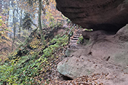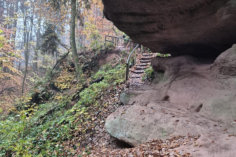Über den Rücken des Galgenbergs führt unsere Strecke nach 3 km zum Schnittlinger Loch, einem ersten Höhepunkt unseres Kurses, wenn man mal von der ganzen Bierlandschaft absieht. Nein, im Ernst, wunderschön geht es durch die wildromantische Schlucht, die auch vom Bayerischen Landesamt für Umwelt als Naturdenkmal erfasst und als Geotop ausgewiesen ist. Fotografisch kann ich das heute leider nicht so festhalten, wie es die Schlucht verdient hätte. Meiner Kamera behagt das dunkle und feuchte Wetter leider überhaupt nicht, so dass ich nur ein paar vorzeigbare Bilder aufweisen kann, die mir zum Teil auch noch von Roland zur Verfügung gestellt wurden. Das Loch ist entstanden durch Unterwaschungen und Unterspülungen. Die Halbhöhlen und Felsabstürze mit einer Höhe von bis zu 15 m erstrecken sich über eine Länge von etwa 50 m. Zuerst geht es für uns kurz runter, über eine Brücke und direkt im Anschluss dürfen wir unter einer überhängenden Felswand wieder aufwärts klettern. Wirklich großartig.