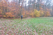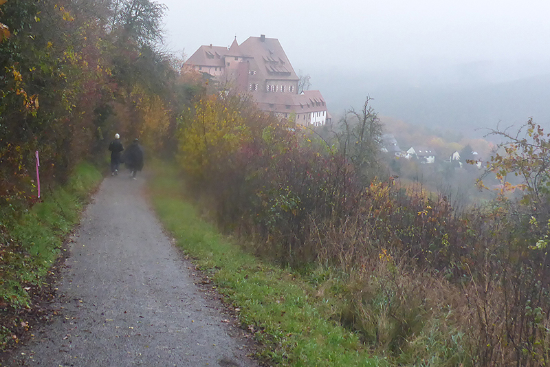 Über die Hauptstraße durchqueren wir den 100-Seelen Ort Theilenberg. Es geht wieder leicht abwärts, aber ich bin mittlerweile im Alarmmodus, wenn ich über 100 Meter keine Streckenmarkierung mehr sehe. Mein inneres Gefühl gibt mir recht, als ich mich umdrehe, winken mir zwei Mitläufer zu, ich solle umkehren. Die Straße ist nass, so habe ich den verwässerten Kreidepfeil übersehen. Heute ist irgendwie der Wurm drin. Mit dem Verläufer übernehme ich auch die Rote Laterne. |
