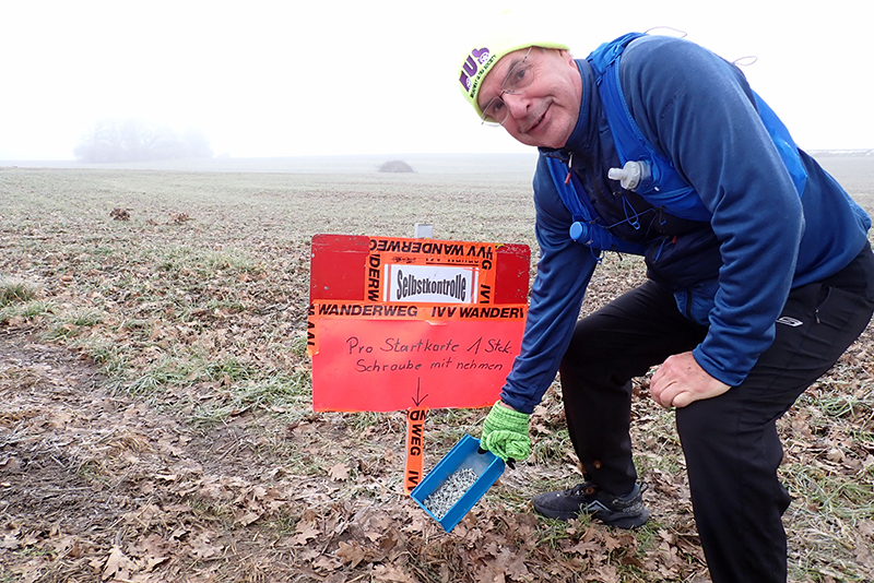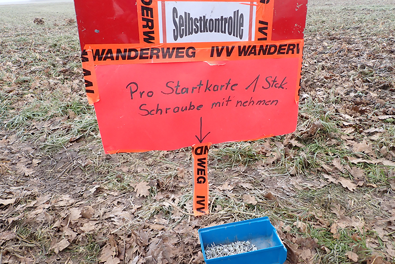 Die Strecke ist abwechslungsreich. Viele leichte Anstiege gilt es zu bewältigen. Wälder, Felder und kleinere Ortschaften werden durchlaufen. Jürgen und ich sind fasziniert. Immer wieder überholen wir die gleichen Wanderer, die sich auch immer wieder aufs Neue freuen, dass wir an ihnen vorbeilaufen. Offensichtlich machen wir längere Pausen als sie. Am Ende werde ich meine Uhr kontrollieren und feststellen müssen, dass wir insgesamt tatsächlich 90 Minuten Pause gemacht haben. Das kam mir jetzt wirklich nicht so vor. Die kürzeste, aber lustigste Pause haben wir auf einem Feldweg im Nirgendwo. Kurz zuvor hatte ich Jürgen noch von einer Selbstkontrolle erzählt, bei dem mir der Lautner Toni den Stempel auf die Karte gedrückt hat. Schon erreichen wir solch eine Selbstkontrolle und wir haben uns gleich selbst nicht mehr unter Kontrolle. Wer auf diese Idee kommen ist, hat vermutlich eine Schraube locker. Am Wegesrand steht eine blaue Plastikbox mit Schrauben und Beilagscheiben. Auf dem Hinweisschild steht, dass jeder Wanderer eine und wirklich nur eine Schraube entnehmen und im Ziel vorzeigen muss. Wir kriegen uns kaum noch ein. Wie kommt man auf eine solche Idee? Wir finden es genial und setzen unseren Weg fort.