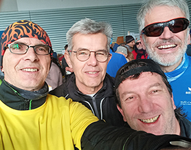 | Beim Start am Sonntagvormittag betrug die Temperatur Sechs Grad, dazu empfingen Wolken die Teilnehmer im Start- und Zielgelände in Gmund. Am Vortrag mussten noch bei ununterbrochenen Regen-, Schnee- und Graupelschauern und gerade einmal drei Grad viel Arbeit aufgewendet werden, damit die 5000 Teilnehmer perfekte Bedingungen erleben konnten. Während des Rennens blinzelte sogar gelegentlich die Sonne durch die Wolken. Mario betätigte sich als Pacer und begleitete eine Arbeitskollegin bis ins Ziel. |