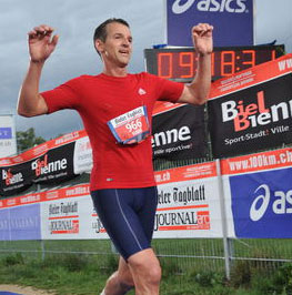 1600 Läufer/innen  nahmen die Strecke   im Schweizerischen Biel  unter die Füsse.  Vor dem Start und bis tief in die Nacht wechselten starke   Schauer und leichter Nieselregen sich ab, erst mit Aufgang der Sonne legte sich der Regen. Rechtzeitig zum starken Zieleinlauf von Hans. Mit 9:18 konnte er sogar Dieter Baumann (9:45) abhängen.