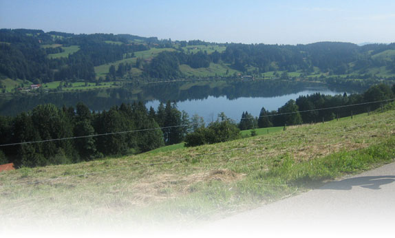 Blick auf den tief im Tal liegenden Großen Alpsee und sein
