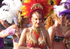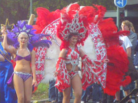 Das ist eine Gruppe von Mädels in rot-schwarzen Kostümen