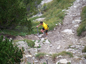 bei km 10 wieder bergab. Vorsichtig laufend gehe ich den Bergablauf