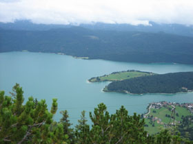 einen herrlichen Blick auf den in der Sonne liegenden Walchensee,