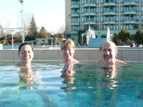 12 Grad zeigt das Thermometer, in der Sonne ist es noch deutlich wärmer, so lässt es sich vor dem Johannesbad auch noch ohne wärmende Kleidung gut aushalten. Trotzdem ruft für mich die Pflicht, ich muss mein Bad in der Therme nehmen. Ohne mein Entspannungsbad verlasse ich nicht diesen Ort. Ist mir sogar lieber als die Massage, die gäbe es aber auch noch gratis dazu. |