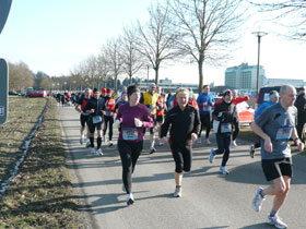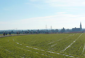 Nach gut vier Kilometer erreichen wir am Golfplatz den Schnittpunkt des Kurses, der grob die Form einer Acht aufweist. Wenn heute Spielbetrieb auf dem Golf-Parcour wäre, könnte es für uns gefährlich werden, meint zumindest ein hier aufgestelltes Hinweisschild. „Lebensgefahr durch fliegende Bälle“ halte ich aber doch für reichlich dick aufgetragen. Immer noch geht’s Richtung Westen und von dort weht uns noch ein spürbar kühlender Wind entgegen. Bei km 5 steht, wie all die Jahre zuvor auch, der Manne und betet uns alle 5 Sekunden die gerade abgelaufene Brutto-Zeit herunter.