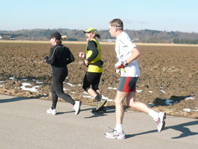Dann geht’s für mich auf zur zweiten Runde, Motivationsprobleme gibt’s bei dem Wetter natürlich nicht. Obwohl meine 2 Stunden nach der Hälfte überall ein Mittelplatz wären, bin ich beim Thermen-Marathon jetzt fast alleine auf weiter Flur unterwegs und befinde mich im Klassement im hinteren Fünftel. Liegt vielleicht daran, dass hier eine Sollzeit von 5 Stunden vorgegeben ist und langsamere Läufer erst gar nicht antreten, oder auch daran, dass die Partyläufer um diese Jahreszeit auch noch Winterschlaf halten.