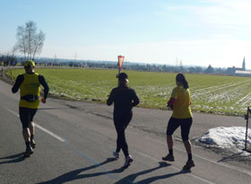 Am Ortseingang von Kirchham können wir uns den ersten warmen Tee und dazu Riegel und Obst zum Knabbern genehmigen, es gibt’s natürlich auch Wasser, das hat aber Kohlensäure berichtet man mir, was auch nicht jeder mag. Margot und Jan haben zu mir aufgeschlossen, sie ist heute gut drauf und sollte es gut laufen, ist auch die langersehnte HM-Bestzeit unter 2 Std. drin.