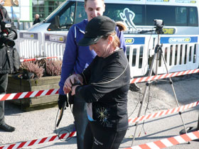 Wieder am Schnittpunkt unserer Achterbahn vor dem Golfplatz hat der Veranstalter zwei Ordner postiert, nicht dass da einer auf dumme Gedanken kommt und 10 km überspringt. Für unseren Zeitnehmer Manne ist es auch ruhig geworden, der steht ein paar Meter weiter und hält die Stellung, um auch den Letzten die 25 km-Durchgangszeit durchzugeben. Kurz danach erreiche ich die Getränkestation in Kirchham. Aber hoppala, was kann mein geschultes Auge da erspähen, der Stationsvorsteher hat sich ein Fläschchen Schaumwein zwischen den Wasserbechern deponiert. Auf meine Anfrage hin lässt er sich nicht lumpen und schenkt mir einen Becher ein. Ist doch gut für den Kreislauf, heißt es.