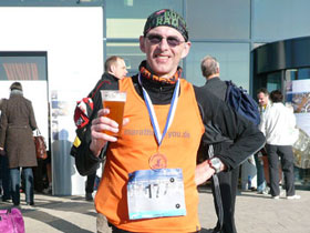 Bis KM 33 habe ich immer Jan in ca. 400 m Abstand vor mir in Sichtweite, aber dann wird es für mich doch zähflüssiger und ich muss noch einige Federn lassen. Aber mit einer passablen Zeit komme ich ins Ziel, wo mir die wunderschöne Glasmedaille überreicht wird. 259 Finisher kann der Marathon in der Liste aufweisen, es gibt aber auch noch den einen oder anderen, der es nicht unter 5 Stunden geschafft hat und so auch nicht im Klassement erscheint. Wenn es was zu meckern gibt, dann sind es diese 5 Stunden Zielzeit. Magic hat es auch wieder unter 3 Std. geschafft, trotz seiner Sprüche hat er wieder Vollgas gegeben und hat mit 2:59 seine Bestzeit nur knapp verfehlt. Gereicht hat das für den 3. Altersklassenplatz und 12. Gesamt.