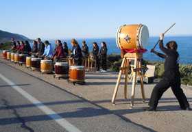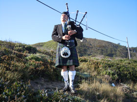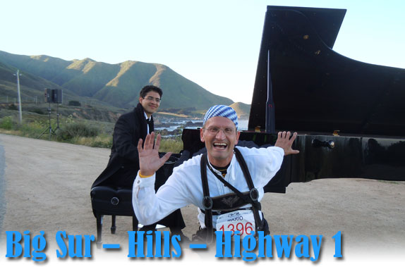 Ich fotografierte viel im 1. Teil der Strecke, dachte mir lieber jetzt als auf dem Rückweg. Als Unterstützung auf der Strecke gab es viel musikalische Unterhaltung aus allen Stilrichtungen, das motivierte mich zusätzlich. Der berühmte Pianospieler mit seinem Flügel fand am Streckenrand auch seinen Platz, normalerweise steht er an der Bixby Bridge. Dieses Foto war Pflicht für mich. So ging das Ganze bis zur Wendemarke bei der Rocky Creek Bridge, Hills mal rauf, mal runter, Flachstrecke Fehlanzeige. Der Tempoläufer für 3:30 befand sich immer in meiner Nähe, alles war bestens, ich hatte genügend Vorsprung zu meiner anvisierten Zeit. Der Wendepunkt ist aber nicht die Hälfte der Strecke, denn auf dem Rückweg wurde noch ein ca. 2 Meilen Umweg in den Point Lobos State Park kurz vor Carmel eingebaut, der niemals in der Historie des Rennens Bestandteil der Strecke war.