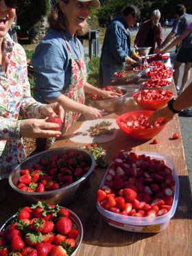 Auf dem Rückweg fühlte ich die zunehmende Wärme ab Meile 13 und ich nahm bewusst Tempo raus um Kräfte zu sparen, aber im Laufe des weiteren Weges wurden durch die vielen Hügel die Beine immer schwerer, was weitere Temporeduzierung bedeutete. Ich sah auf der Gegenseite die nach mir kommenden Läufer, was mich etwas beruhigte, so schlecht war ich noch gar nicht, denn es waren noch viele. Wasser- bzw. Getränkestationen mit Gatorade und auch an zwei Stellen Gels, aber nirgends Coke …unvorstellbar. An der fehlenden Flüssigkeit lag es nicht, die Sonne brannte erbarmungslos auf die Läufer nieder, Schatten ist Fehlanzeige. Bei Meile 21 kam eine Besonderheit als Streckenverpflegung, Erdbeeren, riesengroß (Generdbeeren?), ich stopfte sie trotzdem nur so rein.