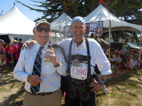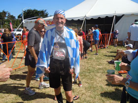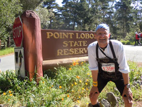 Kurz vor Carmel ging es in den Point Lobos State Park, da gab es zu ersten Mal ein wenig Schatten, was mir guttat. Nachdem wir diesen Park verlassen hatten, rief mir kurz jemand zu, nur noch eine Meile.Aber was sah ich, nein nicht das Ziel in Carmel, davor gibt es noch eine Erhebung, die hatte ich schon ganz vergessen. Ich hätte fluchen können, da musst du jetzt im Laufschritt hoch, erst am Top des Hills kannst du das Ziel in Carmel mit den Zuschauern sehen. Was soll‘s, ich überstand auch das und konnte mich beim langen Downhill so richtig auf den Zieleinlauf vorbereiten. Ich sah am Streckenrand Bob und Linda gemeinsam mit Beate stehen, zog die Landesflagge von Bayern passend zur Tracht aus der Hose (die Schwaben mögen es mir verzeihen, nachdem ich schon so lange als Gastarbeiter hier wohne und mich wohlfühle) und lief glücklich nach 3:50 ins Ziel ein.