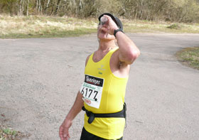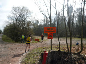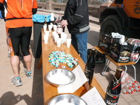 Auf dem Vorplatz ist ein Wendepunkt, an dem jeder der ordnungsgemäß durchkommt einen Stempel auf die Startnummer verpasst bekommt. Danach ist Verpflegung angesagt. Die Tafel ist reichlich gedeckt. Bananen, Butterstullen mit Salz und auch Haferschleim werden angeboten. Ähnlich wie Rennsteigläufer das gewohnt sind, bloß die dort üblichen Geschmacksrichtungen hat man hier weggelassen, es gibt nur Naturgeschmack. Ich genehmige mir einen Becher …mmhh, ja, wirklich, schmackhaft wie am Rennsteig. Zum nachspülen wird Köstritzer in drei Varianten geboten: als Schwarzbier, Pils und Alkfrei für die Schwachen, hihi. Das braucht man mir natürlich nicht zweimal sagen, in Bayern ist das ja ein Grundnahrungsmittel, ich nehme das mir schon bekannte Dunkle.