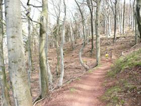 Der Eintritt in den bergigen Teil beginnt bei Km 12, kurz vorher können wir aber noch die schöne Aussicht auf den Stausee Kelbra genießen, der der größte See der Region und zugleich ein Rückhaltebecken für Hochwasser ist. Ab hier geht es runter vom Teer und hinauf auf den Kulpenberg, zum höchsten Punkt der Strecke. Im Wald wird es sofort spürbar wärmer, der kalte Wind kann uns nur mehr wenig anhaben. Der Anstieg auf den höchsten Punkt des Kyffhäuser verläuft relativ unspektakulär, sprich steilere Anstiege, alles ist eigentlich ohne Gehabschnitte gut zu meistern.
