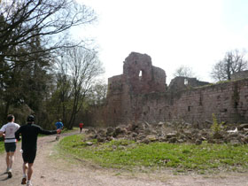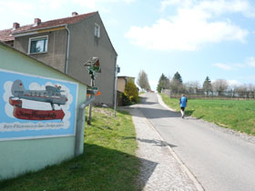 Gut gestärkt geht’s wieder runter und um die Burganlage herum, unten passieren wir die noch ganz gut erhaltenen Ruinen der Unterburg, mit einem Blick hinauf können wir uns vom Kaiser-Wilhelm-Denkmal verab-schieden. Über den Dreiforststein und Seebersbrunnen mit wenigen Höhen-unterschieden geht es durch blühende Streuobstwiesen hinab nach Udersleben. Das Schild „Gefährliche Abfahrt“ soll uns wohl vor übertriebener Tempohatz warnen.