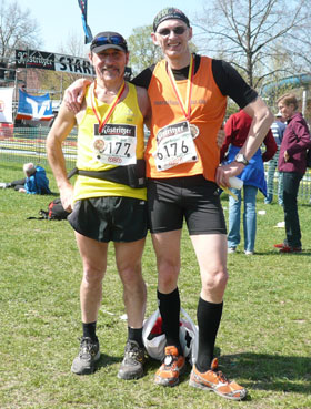 Hier gibt es die Startnummern (der Chip ist auf der Rückseite gleich aufgeklebt), einen separaten Nachmeldebereich, die Nudelparty und die Siegerehrung wird hier auch stattfinden. Auf einer kleinen Läufer- und Bikermesse kann man sich noch mit benötigten Utensilien eindecken. Unter anderen am Stand von Ex-Olympiasieger Waldemar Cierpinski, der sicher beste Beratung bietet.