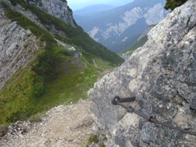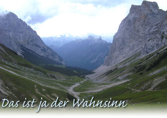 Am Stand wird uns eine leckere Tomatensuppe serviert, dazu hätte ich gerne Cola. Bei Nachfrage wird mir ganz verschämt ein verdünntes Schlückchen eingeschenkt. Nach ausgiebiger Verpflegung steht die letzte Prüfung an, der Aufstieg bis unterhalb der Albspitze. 1200 Höhenmeter müssen auf den nächsten 12 km überwunden werden. Als ersten Höhepunkt passieren wir den Eisernen Steg über die Partnachklamm, jedes Jahr besuchen die Klamm mehr als 200.000 Menschen. Bereits 1912 wurde sie touristisch erschlossen und zum Naturdenkmal ernannt. Die Länge beträgt ca. 700m und in die Tiefe geht es 80m.