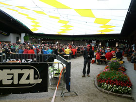Für Ortsunkundige, die Gemeinde liegt im Landkreis Garmisch-Partenkirchen, ein paar Kilometer entfernt von Garmisch. Der bekannteste, in Grainau Geborene wird wohl der Hans-Joachim „Striezel“ Stuck sein, der jetzt am Wochenende übrigens seine lange Rennfahrer-Karriere beendet hat. Die Startunterlagen im Kurhaus sind schnell empfangen, danach können wir noch durch die Trailrunning-Expo schlendern und ein paar Einkäufe tätigen, bevor wir es uns im Festzelt gemütlich machen. Zumindest sieht der Musikpavillon innen mit der großen Zeltplane danach aus, besteht aber aus mehreren festen Gebäudeteilen, über dessen freien Platz die Plane gespannt ist.