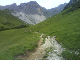 Nach der Kontrollstelle verlassen wir die Baumgrenze, es geht in einen alpinen Bereich über und es wird deutlich rustikaler und steiler. Jetzt bin ich froh die Stöcke richtig einsetzen zu können. Eine Tellermine versperrt uns an einer Engstelle den Weg, die Streckenmarkierer haben gute Arbeit geleistet und den Kuhfladen mit greller Farbe markiert. Das muss ich natürlich per Foto festhalten, aber die Handy-Fotografiererei nervt mich tierisch, es ist mir einfach zu unkomfortabel und kostet sehr viel Zeit. Der Südwandsteig führt uns hinauf auf das Scharnitzjoch, dem zweithöchsten Punkt des ST-Kurses.17 km und 1150 Hm haben wir hinter uns. Ein letzter Wiederbelebungsversuch meines Fotoapparates schlägt fehl, ich fühle mich irgendwie wie auf Entzug. Als mir Mario seine anbietet, lasse ich mir das natürlich nicht zweimal sagen. Die großartige Aussicht kann ich so gleich mit einer Serie ablichten.