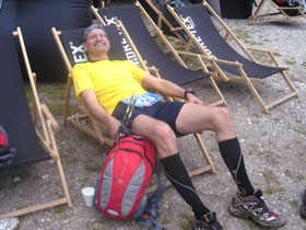 Leckere Tomatensuppe ist das erste was ich mir an Verpflegung schnappe und dann gleich im Liegestuhl verspeise. Das ist wirklich ein guter Service, meine Muckis danken es. Eine ganze Menschenmenge hat sich hier versammelt, weniger Läufer, denn Betreuer und Serviceleute. Der Streckenchef ist auch da und einige Reporter mit Kameras, die werden wohl kaum wegen mir da sein. Nein, natürlich nicht, schon kommt der erste der beiden spanischen Favoriten vom UT angerauscht. Kurz hinter Miguel Heras kommt auch der zweite Iker Karrera Aranburu an. Zwei bis drei Minuten werden sie sich wohl aufgehalten haben und schon sind sie wieder weg. Unmittelbar danach kommt unser deutscher Crack Matthias Dippacher rein. Sofort stürzen sich die Kameraleute auf ihn. Mit der Kamera unter der Nase muss er sich hier verpflegen. Schon mal interessant das mittendrin zu beobachten. Da schieße ich natürlich auch ein paar Fotos aus nächster Nähe.