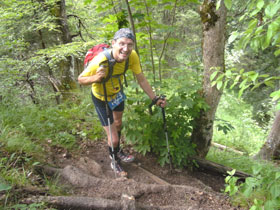 Von einer Helfergruppe werden wir mit dem Verweis: „noch 2km bergab dann kommt die Verpflegung“ den Kälbersteig hinunter geschickt. Nach dem ersten Steilstück kommt ein fantastischen Trail durch den reinsten Märchenwald. Naturtreppen, bemooste Baumstämme und Wurzelbündel wie Nester von Riesenschlangen, Farne, Baumpilze, alles in üppigen Grün, wechseln sich ab. Jetzt fehlt nur noch das Hexenhaus mit Hänsel und Gretel. Und irgendwie, komme ich aus diesem Prachtabstieg wie verhext an der Futterstation im Reintal an der Partnach an. Bis ins Ziel ist „nur“ noch ein Halbmarathon zu laufen. 8 Stunden haben wir bis hierher für die 48 km benötigt, das Zeitlimit steht bei 11 Stunden. Wir haben trotz Schwächeperiode drei Stunden Bonus.