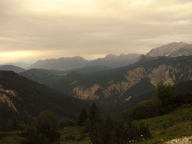500 m weiter kann ich die spektakuläre Aussicht über die Alpen genießen. Mit Sonne wäre die Sicht natürlich deutlich besser, die hat uns aber bis auf ein paar Blitzern aus den Wolken, den ganzen Tag im Stich gelassen. Aber ich möchte mich nicht beklagen, wir hatten bisher optimale Bedingungen zum Laufen. Optimal ist auch der Weg Richtung Alpspitzbahn, aber einfacher deswegen nicht. Steil zieht sich der Wirtschaftsweg zum Osterfelderkopf hinauf, zudem bläst uns ein kalter Wind entgegen. Viele bedienen sich hier ihrer Wärmeklamotten.
