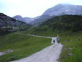 Im Sandwich zwischen Gehren- und Leutascher Dreitorspitze geht es runter vom Berg. Der 1050 Hm lange Abstieg ist aber nicht von Pappe. Durch die Regenfälle der Nacht sind die Pfade und Wiesen, durchsetzt mit Felsen und Steinen, äußerst glitschig und schlammig. An manchen Stellen pappt einem der Dreck zwischen den Stollen, was das Gewicht der Schuhe gefühlsmäßig gleich verdoppelt. Weiter unten geht es durch den Wald, in dem man es wieder mehr laufen lassen kann. Aber das Ganze geht unglaublich in die Oberschenkel und die sind jetzt fast am platzen, da bräuchte es jetzt Muskelpakete wie sie manche Radler haben. 7,5 km bergab liegen am Hubertushof in Reindlau hinter uns, wo auf Mario und mich die nächste VP erwartet. Der Cut liegt hier, nach nicht ganz 25 km bei 5:45 Std. Durch einen aufgeblasenen Tunnel geht es rein in die Station. Jede Menge Leute sitzen und stehen in der Röhre, ob hier auch der angekündigte Ärztecheck vorgenommen wird, kann ich nicht ausmachen, aber könnte sein. Aufgehalten werde ich jedenfalls nicht, vielleicht sehe auch noch zu gut aus, sie schaun aber auch nicht auf meine Oberschenkel. Interessanter wird es natürlich für den Dottore erst, wenn die Läufer des 100ter hier eintreffen.