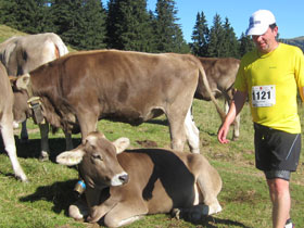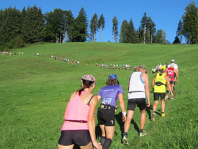 Pünktlich um acht Uhr wurden wir auf die Strecke gelassen. Bernie und Jan gingen die Sache eher gelassen an. Bei Charly und mir dürfte die Nervosität doch erkennbar gewesen sein. Zwei Kilometer führten uns flach an den Ortsrand von Sonthofen. Kurz nach dem wir den Sonthofer Baggersee passiert hatten, ging‘s endlich los. Der erste Anstieg lag vor uns. Wir hatten uns ja geschworen von Anfang an jeden Anstieg zu gehen und daran hielten wir uns auch strikt. Hatte es beim Start noch 14° C, war die Temperatur bis jetzt jedoch schon deutlich gestiegen und das sollte sie auch weiterhin ohne Rücksicht auf uns Läufer tun.