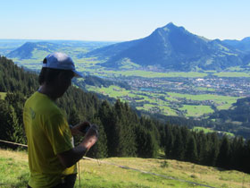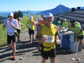 Kurz bevor wir neun Kilometer passiert hatten erreichten wir die zweite Verpflegungsstelle an der Weltcup-Hütte Ofterschwang. Eine wunderbare Aussicht über Sonthofen konnten wir genießen. Charly und ich waren auch noch gut gelaunt und konnten es kaum erwarten weitere Höhenmeter zu erklimmen. Weiter ging‘s in Richtung Weiherkopf.