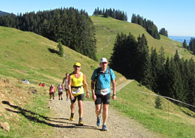 Allerdings hatten wir den höchsten Punkt bei 1651 hm hinter uns. Unser nächstes Ziel musste Grasgehren sein. Bei km 19 wartete dort die nächste Verpflegungsstation und die Cut-Off-Zone auf uns. Wer nicht nach 3 Stunden und 15 Minuten dort ankam, wurde unwiderruflich aus dem Rennen genommen. Auf dem Weg dorthin machten wir uns alle über Jan Gedanken. Der lag hinter uns und war auch bei übersichtlichen Streckenteilen nicht mehr zu sehen. Hoffentlich war bei ihm alles in Ordnung. Charly und ich, erreichten in Begleitung unseres Bergführers Bernie bereits zwanzig Minuten vor dem Cut-Off die Grasgehren-Lifte. Nun hieß es auch die restlichen 23 Kilometer zu laufen.