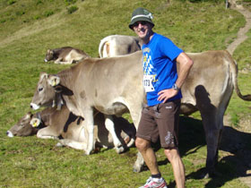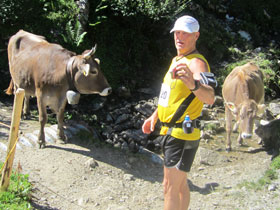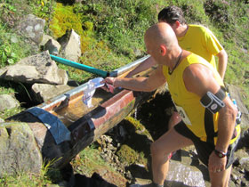 Jetzt konnten wir ein paar Kilometer zusammen laufen. Wir waren uns einig. Bei dieser Wahnsinnshitze kann es nur noch ein Ziel für uns geben: Das Ziel. Bei Obermaiselstein und rund 32 km wartete der letzte große Anstieg auf uns. Neben einem Bauernhof ging es über einen Trampelpfad steil bergan. Ein kleiner Bachlauf verhieß uns Erfrischung. Jan fiel auf die Knie und erfrischte sich.
