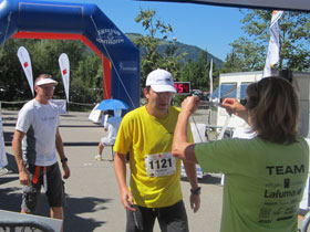 Nach 6 Stunden und 40 Minuten war es dann endlich so weit, ich überquerte die Ziellinie und wurde wie bereits in den vergangenen drei Jahren von Axel Reusch, dem Veranstalter des Allgäu Panorama Marathon per Handschlag begrüßt. Diese Ehre lässt er allen Teilnehmern des Halbmarathon, Marathon und Ultra-Trail entgegenkommen. Nachdem ich meine Medaille um den Hals hatte, winkten mir Bernie, Charly und Jan schon freudig entgegen. Wir hatten alle gesund das Ziel erreicht und darauf waren wir auch mächtig stolz.