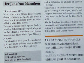 1993 – Vor zwanzig Jahren waren Gabi und ich auf Urlaubsfahrt in der Schweiz unterwegs, begeistert von den Schweizer Bergen und Seen landeten wir im Bödeli, dem Gebiet zwischen Thuner- und Brienzersee. Im Tourismusbüro von Interlaken fiel mir das Jungfrau Top Magazin in die Hände in welchem die Highlights der Jungfrau Region vorgestellt werden. Auf Seite 55 befindet sich die Ausschreibung für den 1. Jungfrau Marathon am 25. September 1993. Viersprachig versteht sich: Deutsch, Englisch, Französisch und …Japanisch. Aufräumarbeiten im privaten Arbeitszimmer beförderten die Broschüre im letzten Jahr wieder ans Tageslicht. Hat doch auch immer was Gutes, so eine Aufräum-Aktion. Mein Appetit wurde wieder geweckt und der Termin noch frei.