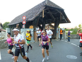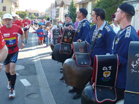 Gestern habe ich mir noch eine Tempotabelle mit Richtzeit 5:30h ausdrucken lassen und nach der will ich mir heute auch den Lauf einteilen. In Böningen (km7) streifen wir das Ufer des Brienzersee. Für musikalische Stimmung sorgen eine Bläsergruppe und wenig später die Herren mit ihren gewaltig scheppernden Treicheln aus gehämmertem Blech. Nicht zu verwechseln mit Glocken die gegossen werden. Kurz nach Wilderswil sind 10 km durch, Zeit mein Tempo auf dem Armband zu kontrollieren. 8 Minuten bin ich nach meiner Zeitentabelle bereits zu schnell, ich muss mich zügeln, so schnell laufe ich mittlerweile nicht mal mehr Flachmarathons an.