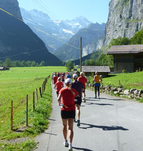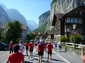 Etwas außerhalb von Lauterbrunnen ist die Halbmarathon-Matte erreicht. Eine kleine Schleife führt uns noch tiefer ins Tal der Wasserfälle. 72 stiebende Wasserfälle gibt es im Lauterbrunnental. Die bekanntesten sind der Staubbachfall mit 300 m Falltiefe und die Trümmelbachfälle. Eine unterirdische Standseilbahn, etliche Tunnels und Brücken erschließen die 10 Gletscherwasserfälle im Berginnern. Wer knapp in der Zeit liegt, für den bietet sich das fast 2 km lange Gefälle des Rückwegs aus dem Tal zum Tempo machen an.