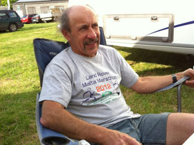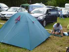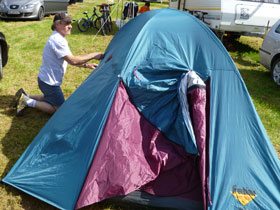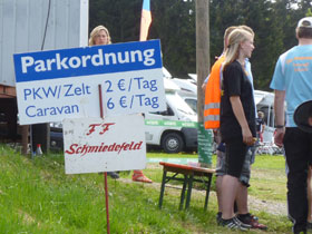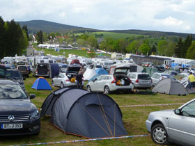 Rechtzeitig machen wir uns auf den Weg und treffen um 16 Uhr in Schmiedefeld ein. Für Auto und Zelt sind je 2 Euro pro Nacht fällig und wir sind drin. Alles klappt wie am Schnürchen, keine Probleme, alle Zweifel sind wie weggeblasen. Die ansteigende Wiese ist bereits gut gefüllt, unterhalb stehen die Wohnmobile, oben die PKWs und Zelte. Wow, mittendrin und live dabei, von unserem Wochenend-Domizil bietet sich ein herrlicher Überblick auf das gesamte Gelände und dem Zieleinlaufkanal. Um 19 Uhr ist diese Möglichkeit heute erschöpft, der Platz ist voll. Also, rechtzeitig da sein, sollte die Devise lauten. „Wenn voll ist, ist voll“ erklärt mir ein Ordner, wer zu spät kommt, hat Pech gehabt, es gibt keine Garantie für diese Plätze.