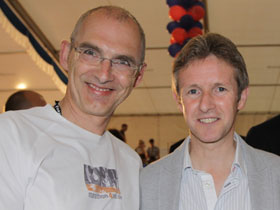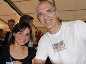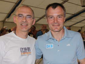Klaus ist auch da, er wird Morgen von der Frauenstrecke berichten …pardon, war nur ein Spaß und auch keineswegs abwertend gemeint und ist auch nicht von mir. Die Laufgründer bezeichneten zu Anfangszeiten den Marathon augenzwinkernd als die Frauenstrecke. „Lass uns mal Joe ärgern“ meint Klaus, der ist doch immer so geil auf seine Promibilder. „Wir machen eine ganze Serie mit dir“. Ok, klar, mittendrin und live dabei. Zuerst ist Jens Weißflog bereit, danach meine Lieblings-Wintersportler: die Biathleten. Mit Andrea Henkel, Frank Luck, Sven Fischer und Christoph Stephan bekomme ich eine schöne Serie zusammen. Frühzeitig verabschiede ich mich von den Feierlichkeiten, die Nacht wird kurz.