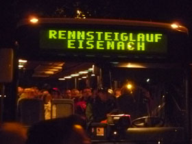 1. Man übernachtet in Eisenach und kann den angebotenen kostenpflichtigen Rücktransport per Bus nach dem Zieleinlauf beanspruchen. Hat einen Haken, der letzte Bus zurück, fährt um 19 Uhr. Somit entfällt die Möglichkeit, die legendäre Rennsteigparty im Festzelt in Schmiedefeld zu besuchen.