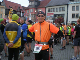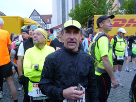 10 Euro sind zu berappen für die Fahrt und der Bus ist wunderbar warm, ich schlafe besser als im Zelt. Ankunft Marktplatz Eisenach 4:45 Uhr. Noch ist nicht besonders viel los. Die Startnummern sind schnell empfangen. Jan muss noch nachmelden, geht auch ruckzuck. In einer Seitenstraße des Marktplatzes ist in einem Innenhof eine Batterie von Dixis aufgebaut, um 5:15 Uhr ist noch nichts los. Wenigstens das wäre erledigt. Zum Trinken kann ich immer noch nichts auftreiben. Auf dem Marktplatz ist ein Festzelt zu Umkleiden umfunktioniert worden, auch sehr praktisch. Kaffee ist aber nirgends aufzutreiben. Auf den Tischen stehen die Trinkflaschen der Sport-kameraden …ich sollte mir eine unter den Nagel reißen. Es muss auch so gehen.