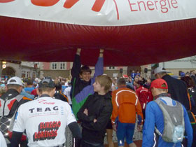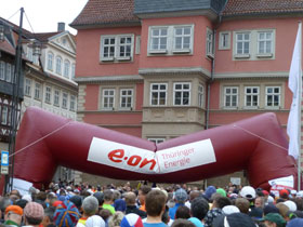 Das gleiche Problem, aber im wahrsten Sinne des Wortes, ereilt heute den Startbogen auf dem Markplatz kurz vor dem Start um 6 Uhr. Es wird improvisiert, ein Helfer steht in der Mitte und stützt das einstürzende Tor mit den Händen nach oben. Alle kommen gut durch, ein einstürzendes Starttor bringt hier keinen aus der Ruhe. Hektik habe ich auf dem Marktplatz noch nie erlebt. Wer hier am Start ist, weiß schon warum. Auf geht’s zum schönsten Ziel der Welt, das liegt ja bekanntlich in Schmiedefeld.
